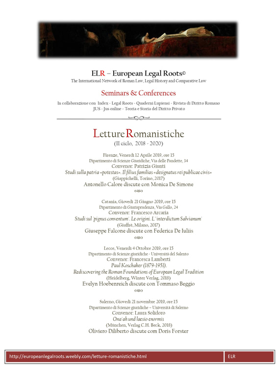 LETTURE ROMANISTICHE (Il ciclo, 2018-2020), Salerno, 21 novembre 2019, ore 15, Università di Salerno, Convenor: Prof. Dr. Laura Solidoro (Salerno): Ich diskutiere mit Prof. Dr. Oliviero Diliberto (Sapienza, Rom) über "Ona'ah und laesio enormis" (München, Verlag C.H. Beck, 2018). → weitere Informationen → website |